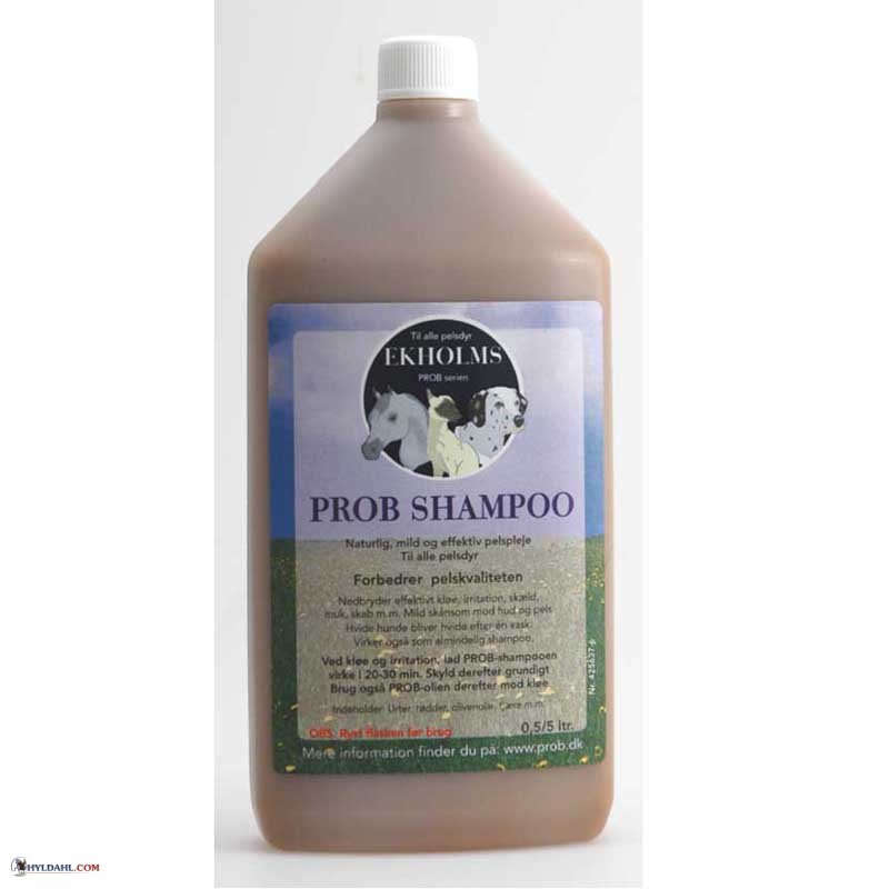 EKHOLMS SHAMPOO kan med god effekt anvendes som almindelig shampoo. Hunden eller hesten får en skinnende ren pels som er let at rede igennem. PROB Shampoo tørrer hverken hud eller pels ud - og kan anvendes på selv sarte dyr. Lyse pelstyper bliver endnu lysere og mørke pelstyper opnår en dyb farve med en smuk glans. Shampooen indeholder ingen blegende substanser.